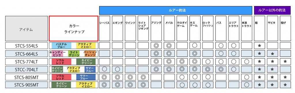 ピュア・フィッシング・ジャパンのアイテム紹介ページでは、機種やカラー、それに対応する釣りのジャンルも分かりやすくまとめられています。