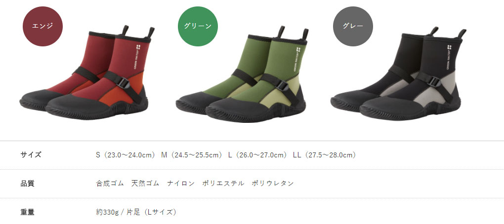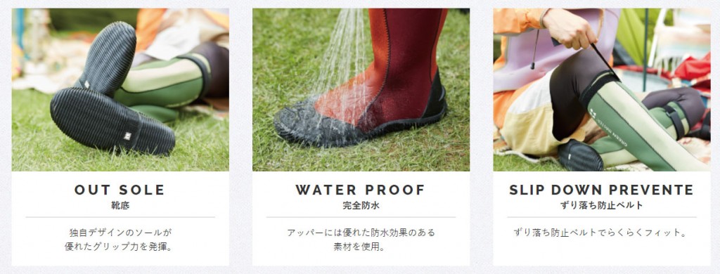機能的にはネオプレーン素材で完全防水、そしてグリップ力のあるソールが特長になっています!