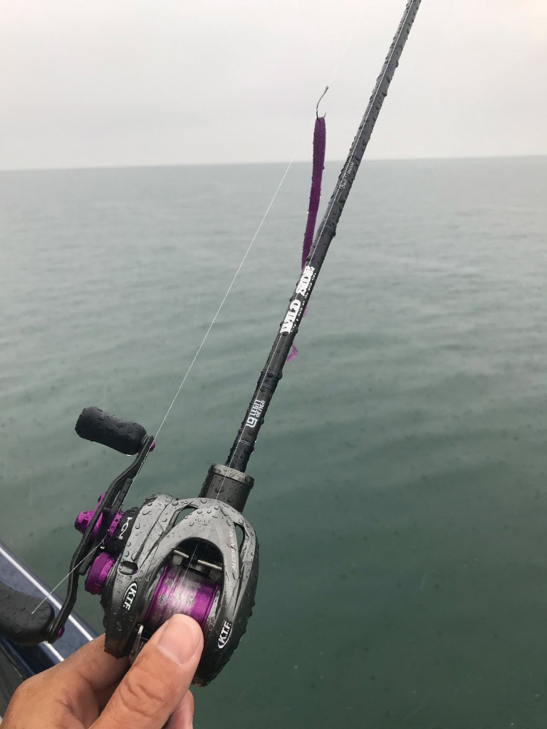 フォールして着底した後は2-3秒ステイさせて、その後はロッドを上にゆっくりと立てていき、フリックカーリーをスイミングさせる。そして、またカーブフォールで着底させてステイさせるだけ。