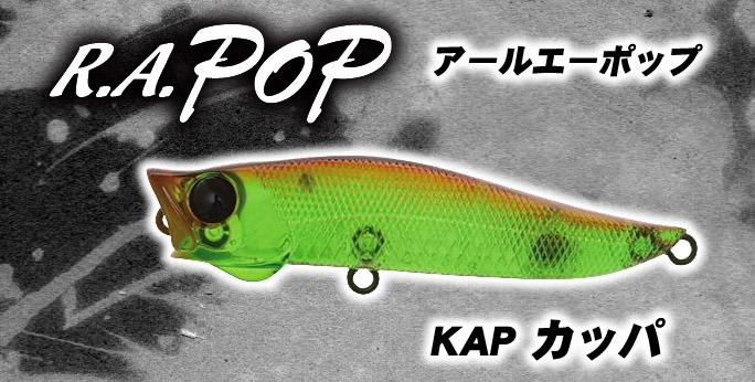 R.A.POPの特徴としてトップチヌ用プラグでは珍しいタングステンウェイトを搭載しておりますので、カッ飛び系ポッパーです! またカラーラインナップも豊富でド派手なカラーからナチュラルカラーまであります。ぼくのお気に入りカラーはカッパです。笑