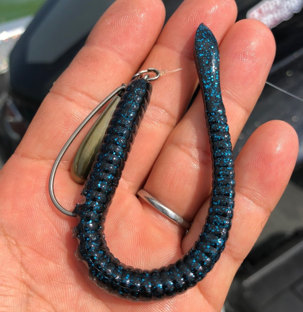 ワームの選び方としては、フッキングの妨げにならない適度な柔らかさ、倒れ込みで水を押すボディー形状である事!そして、水の色が悪いのでシルエットがしっかり出るブラックブルーのカラーがおすすめです。