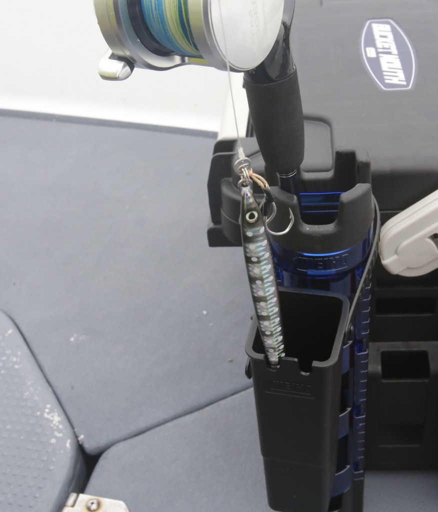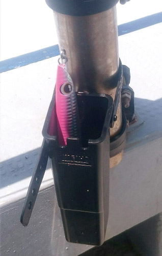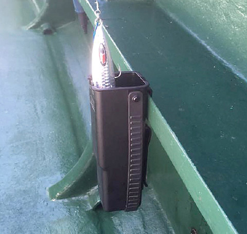 ルアーホルダーBMは、ルアーやジグをセットした状態のロッドを、ロッドホルダーに挿した時に、セットされたルアーやジグが振動で暴れないように、簡易的に収納しておけるホルダー。