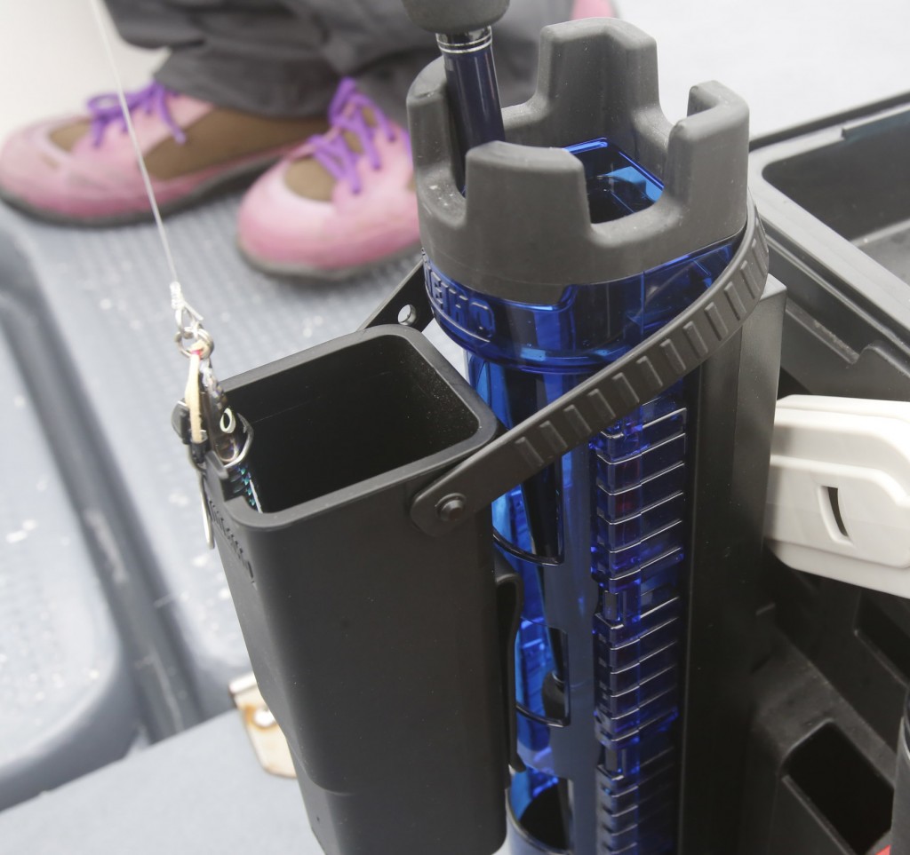 バケットマウス等に装着しているロッドホルダーに掛けて使ったり…。(いろんなロッドホルダーに掛けて使うことも可能)