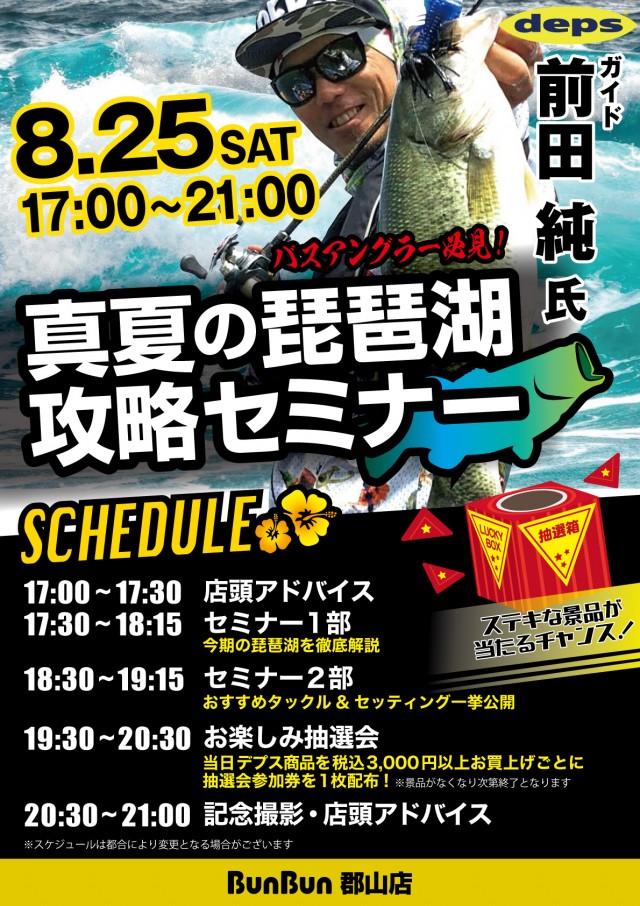 バスアングラーに人気のガイド前田氏による店頭セミナーが8/25に開催される。