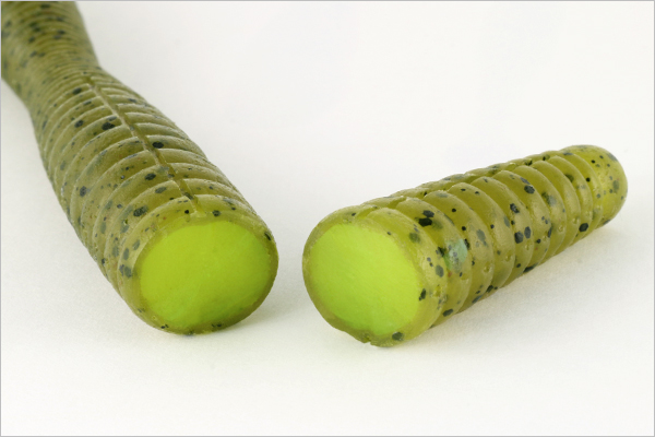 リバウンドスティックは甲殻類成分が配合されたソルト含有率30%のウルトラソフトマテリアル。ボリューミーなワームとなると、どうしても裂けやすいのがネックになります。しかし、フックのクランクやゲイプが刺さるボディ先端部はノンソルトマテリアルでタフ。破損を大幅に軽減してくれます。
