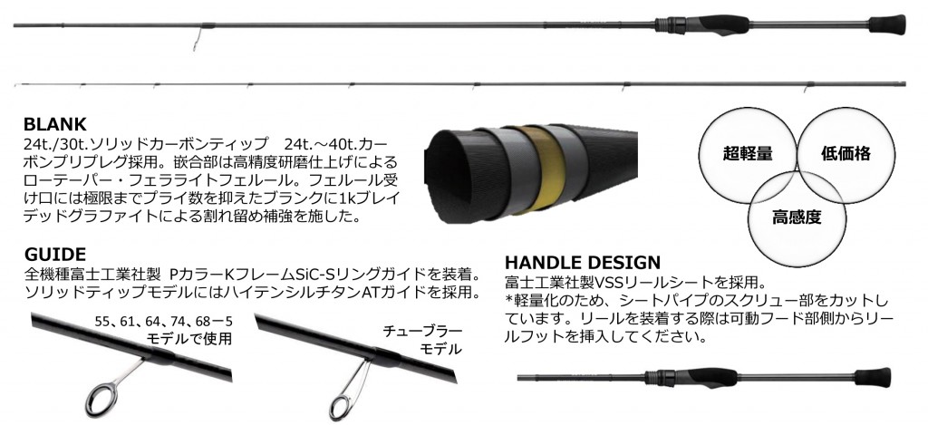 シリーズに共通する特徴としては、かなりの軽量化が図られ、ガイドはSiC-Sリングガイドが採用されるなど、かなり高スペックなんだけど、価格が抑えられていることがあげられます!