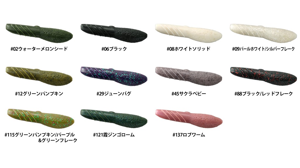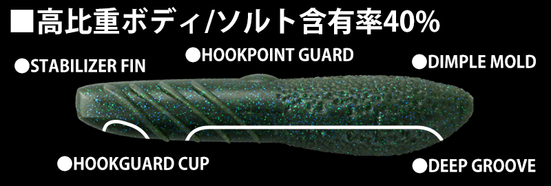 甲殻類成分が配合されたソルト含有率40%の超高比重マテリアル。なんといっても3.5インチというサイズで、16.5gのノーシンカーベイトという事実が特筆事項。ということで飛距離も十分ですよね。