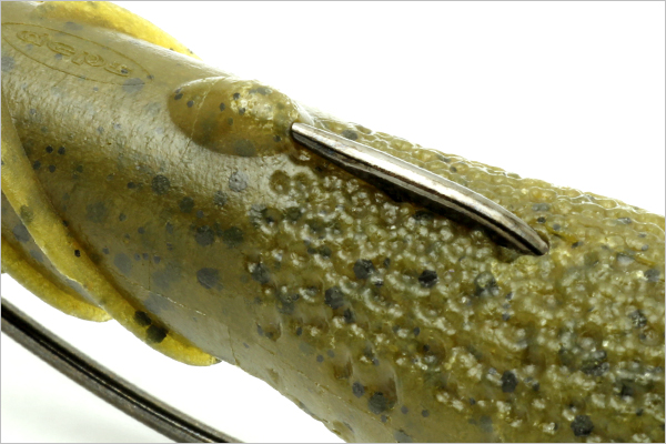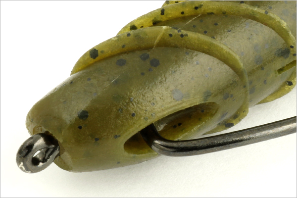また、フックをセットする溝が深く(ディープグルーブ)、オフセットフックのクランク部をガードするカップ、そしてフックポイントを隠す突起パーツにより高いスナッグレス性能を保ちます。推奨フックは#4/0~#5/0。
