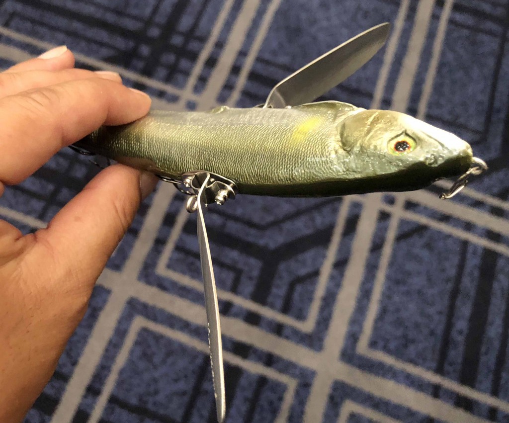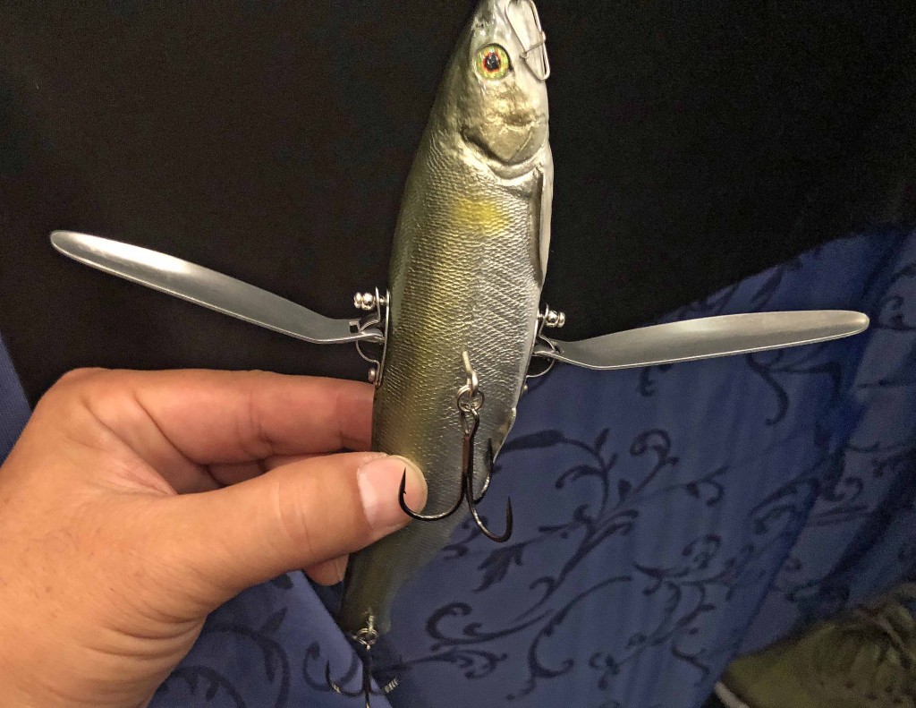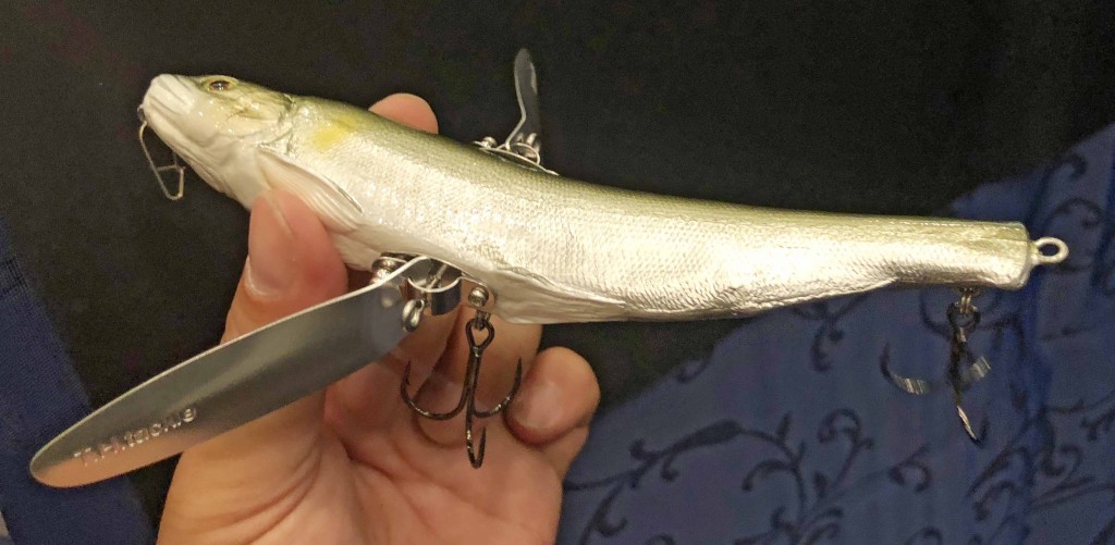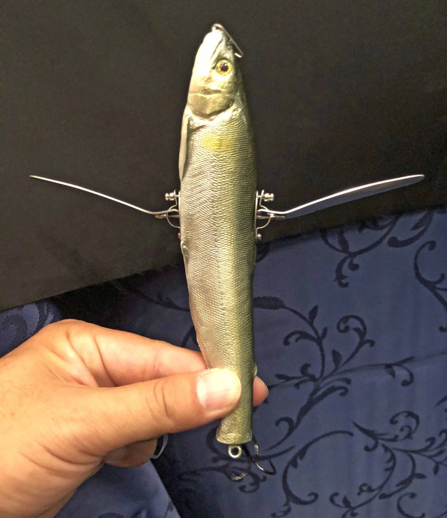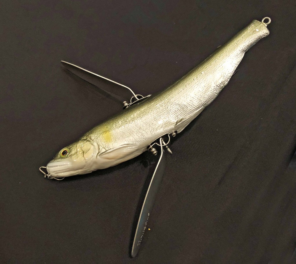 見せてもらった新作はスィートフィッシュクローラー、略してスイクロという名のデカ羽根モノルアーでした!