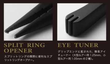 スプリットリングオープナーやアイチューナー、フックスリットなどを標準装備。