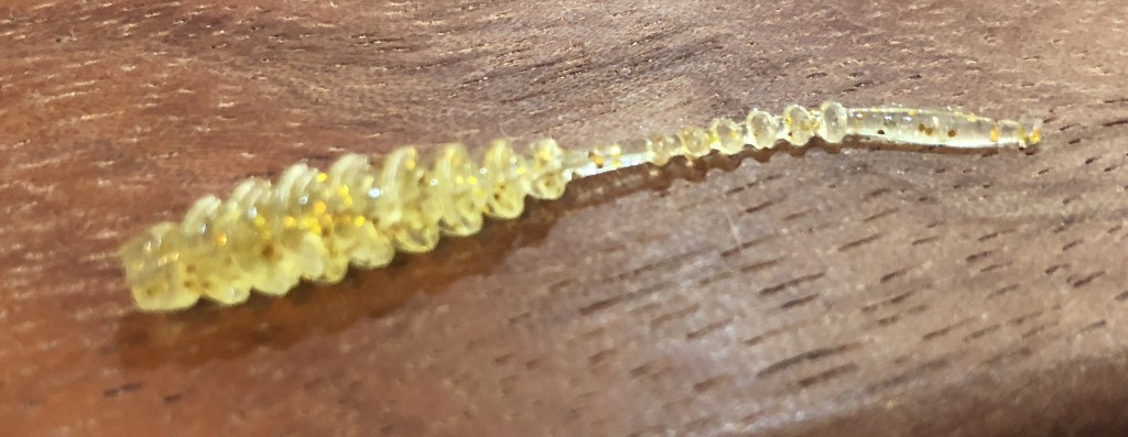どんな構造が採用されているのか? なんですが、ズバリ、ボディ部分に逆リグというか、V字のリブが入っているんです。このリブのおかげで、アクションさせると水を噛みマクり!そしてやわらかく細いテールと相まって、ヌメヌメしたアクションをしてくれるんです!