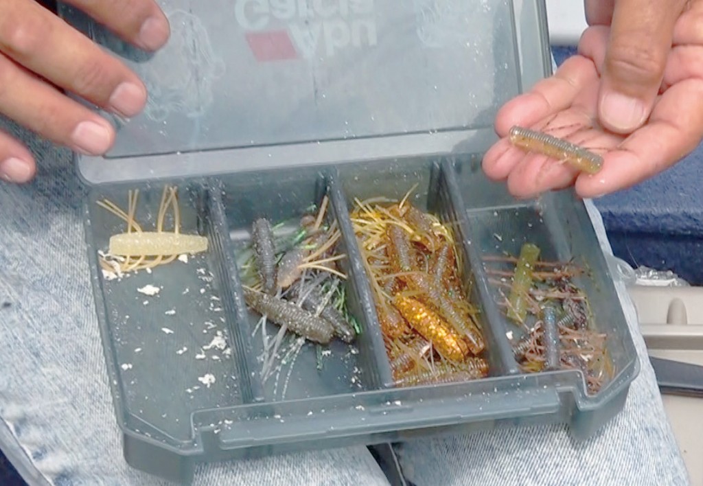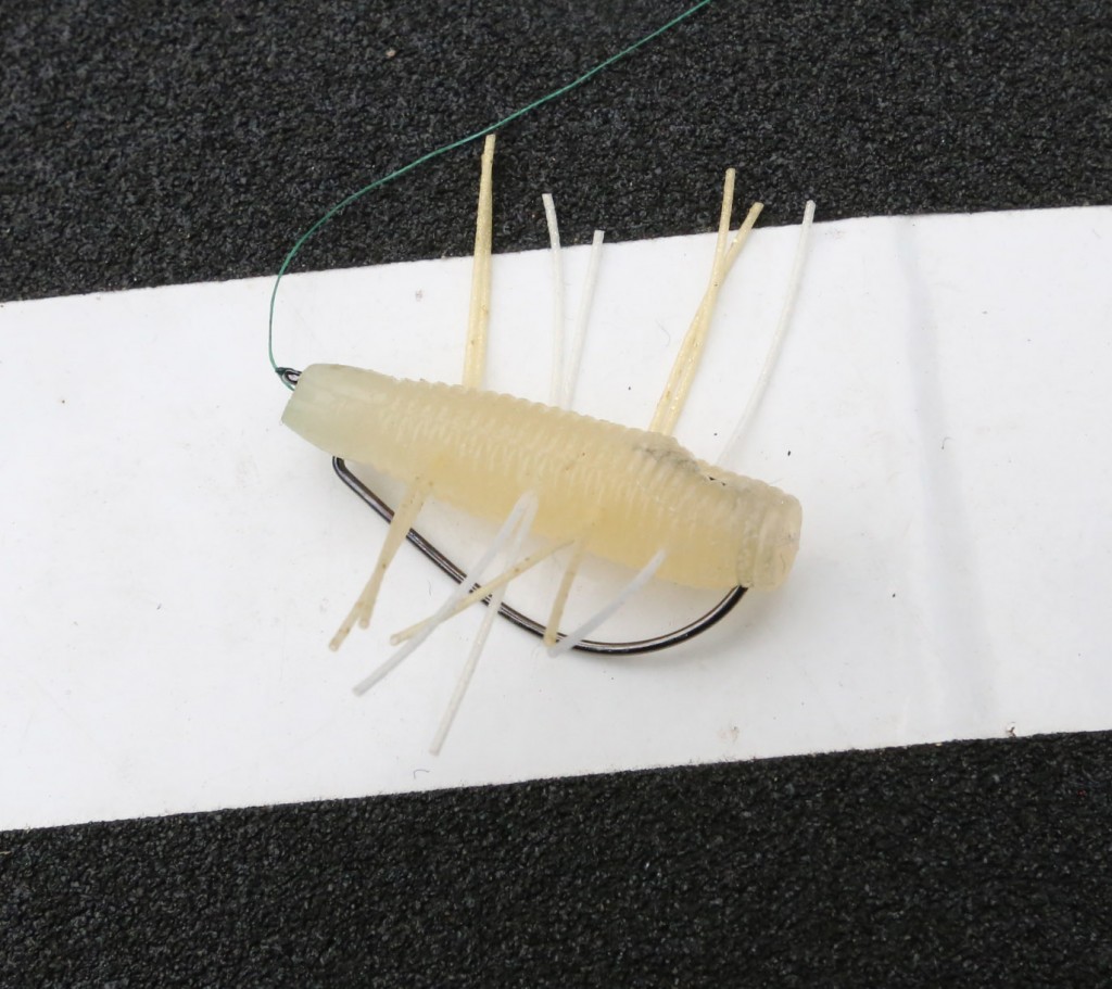 この時期に限らず、バスはわずかなフォールスピードの違いで食ってきたり、まったく無視したりと、けっこうシビアなんだそう。あとちょっとしたシルエットが違うだけでも食う食わないがあるそうな。なので、いろんなワーム、カットしたワームを使ってフォールスピードやシルエットの違うムシルアーを用意! それらをマメにローテして当たりのルアーを探してやることで、かなりの確率でバスに口を使わすことができるとのこと。