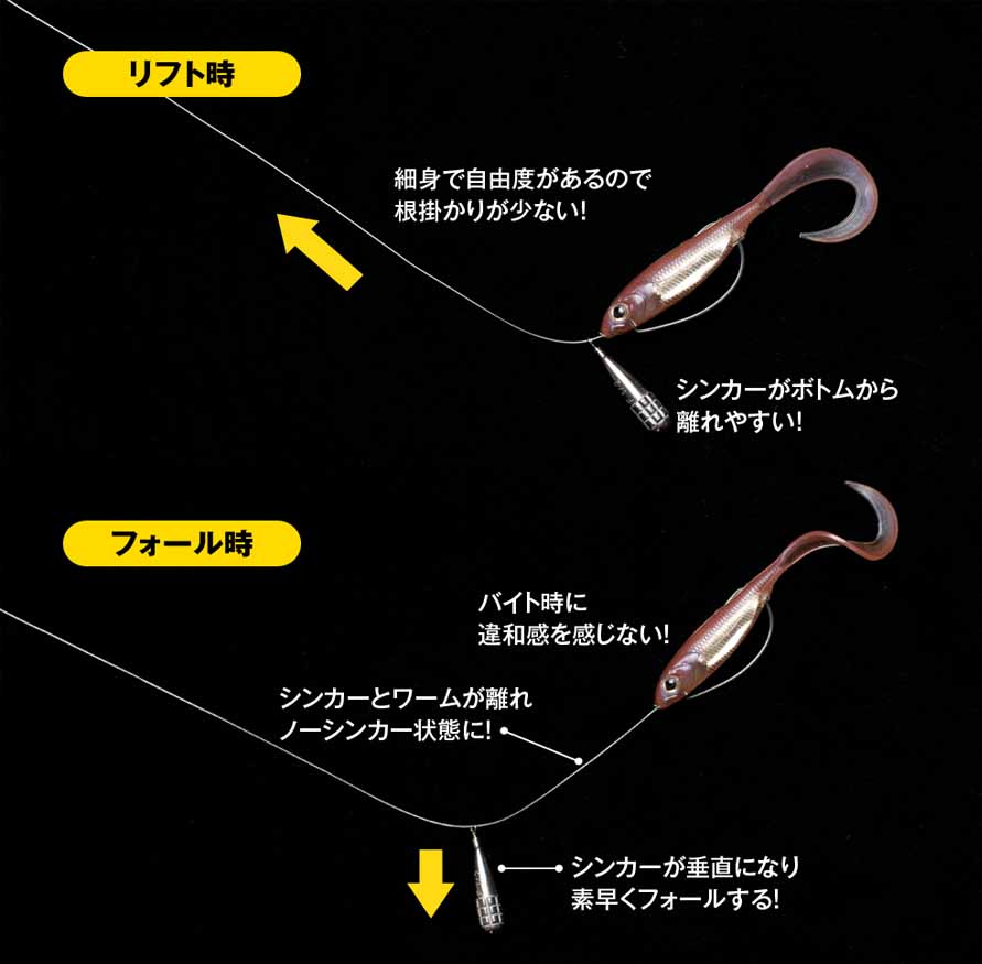 ちなみにフリリグのアクションだけど、色々あるものの、基本的には持ち上げて、その後はワームをノーシンカー状態でフォールさせるというもの。実際、水中ではどんな感じになっているのか?ですが…。