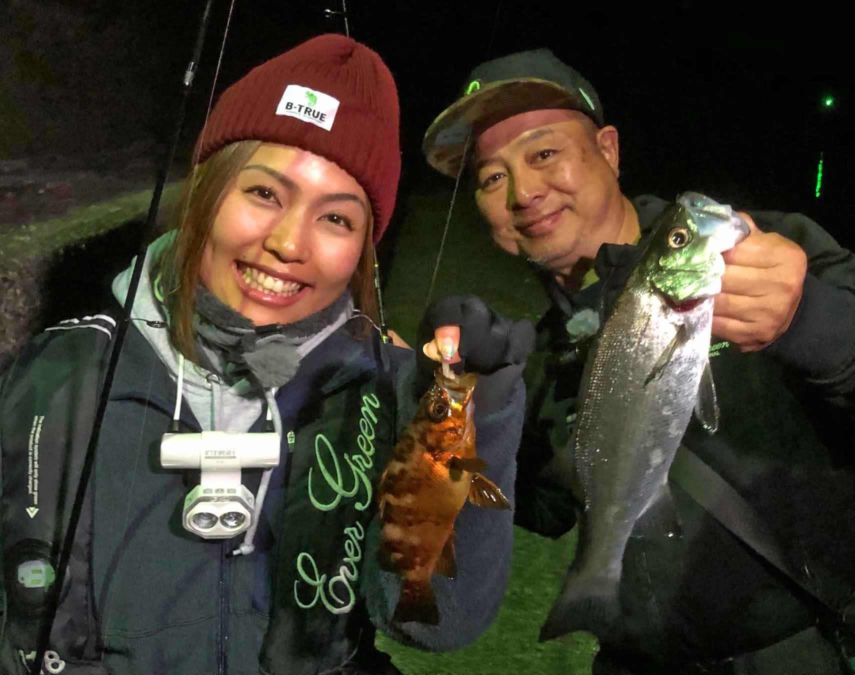 最初のポイントは夕方の漁港。尺サイズのカマスが釣れているとのことで、2人はあの手この手でカマスを狙います。