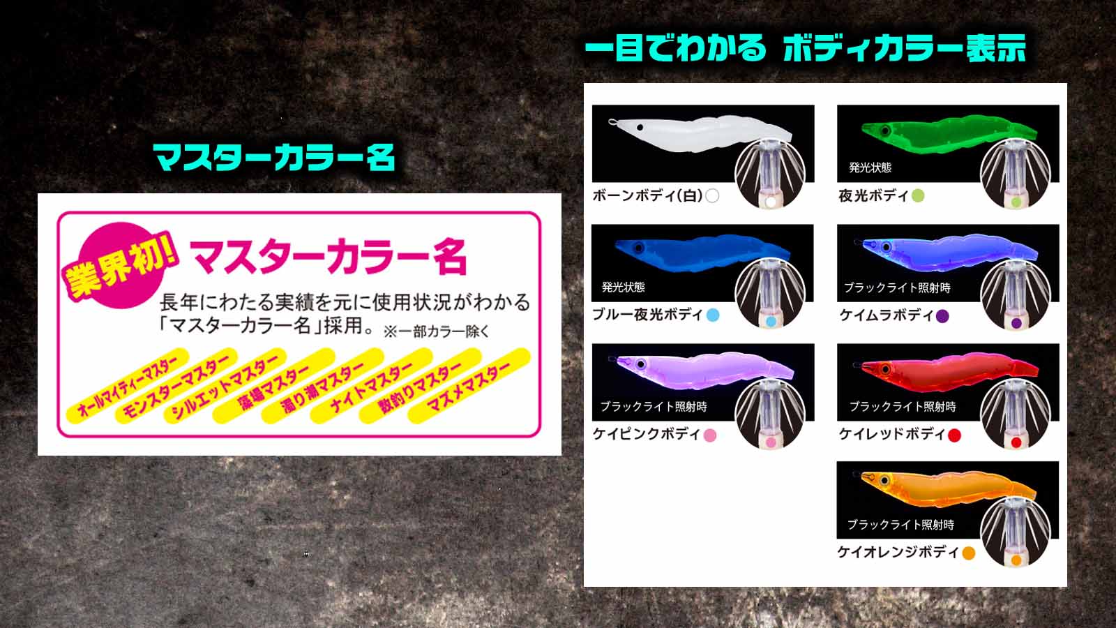 さて、そんなイージーQダートマスターシリーズですが、今年3.5号に新色6色が登場。その6色なんですが、うちわけはケイムラ3色とブルー夜光3色!
